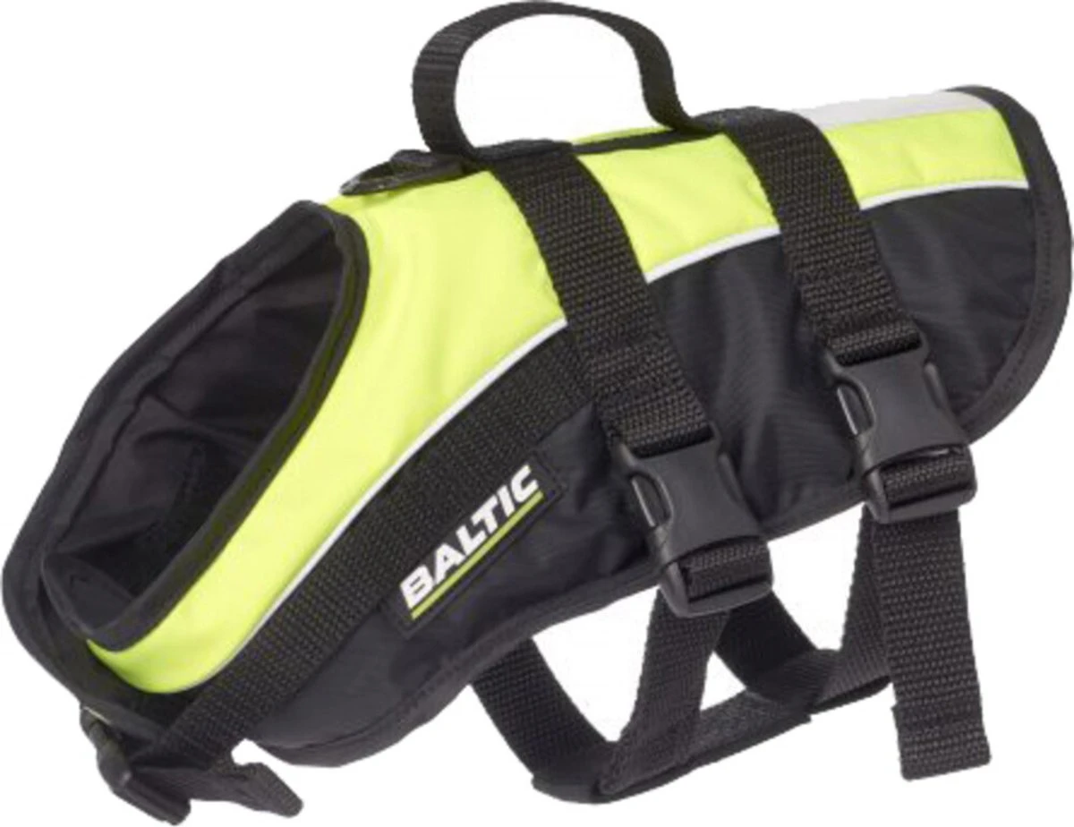 Baltic Hondenzwemvest Mascot Geel – Zwart M Met dit Baltic Mascot zwemvest voor je hond krijgt je hond een veel hogere overlevingskans in het geval dat je hond in het water belanden. Of je hond nu uit een boot valt, van een hoge kade in water, of bijvoorbeeld in zee in een aflandige stroming belandt, dit Baltic zwemvest zorgt voor een sterk verbeterd drijfvermogen waardoor je hond minder snel uitgeput zal geraken. De zichtbaarheid wordt sterk verbeterd door de opvallende kleur en de reflecterende elementen. door het handvat op de rug kun je de hond ook eenvoudig hanteren. Dit is handig om hem/haar uit het water te halen, maar ook om hem of haar gemakkelijk aan boord te tillen.