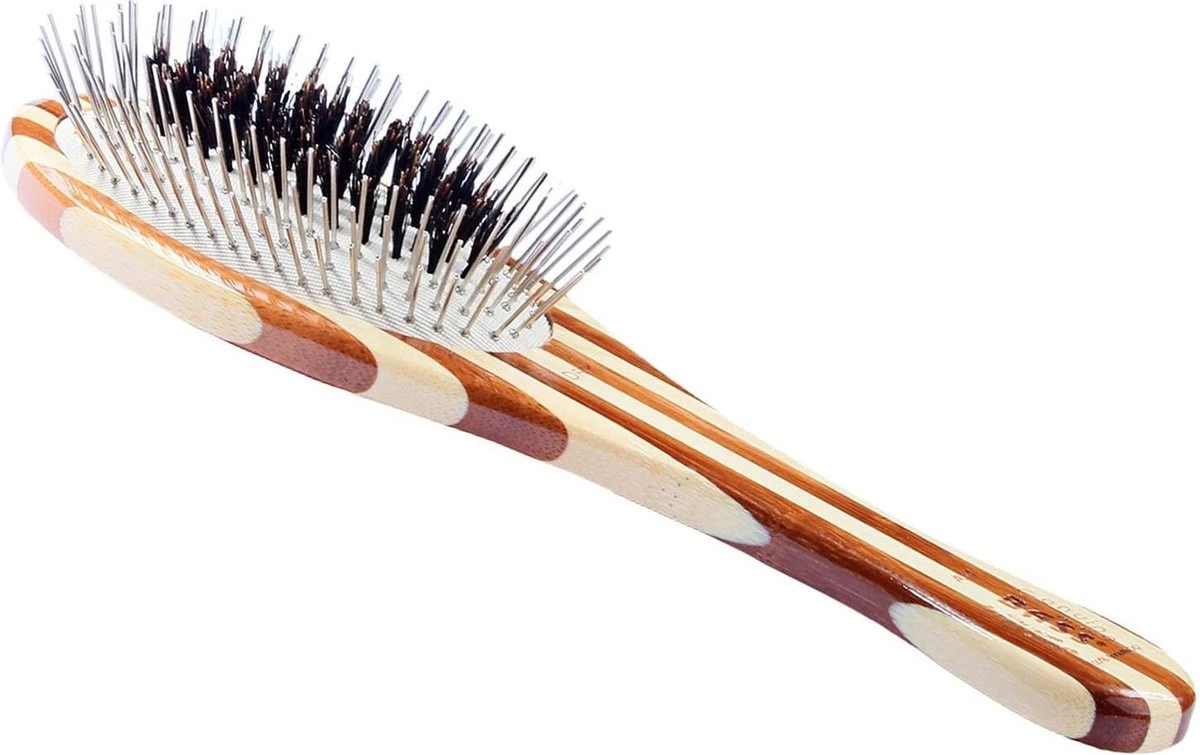 Het zwijnenhaar in de hybride borstel zorgt voor een mooie glanzende vacht. Terwijl je tegelijkertijd de vacht onderhoud met de pinnen die op de borstel zitten. De borstel heeft een 100% bamboe handvat.