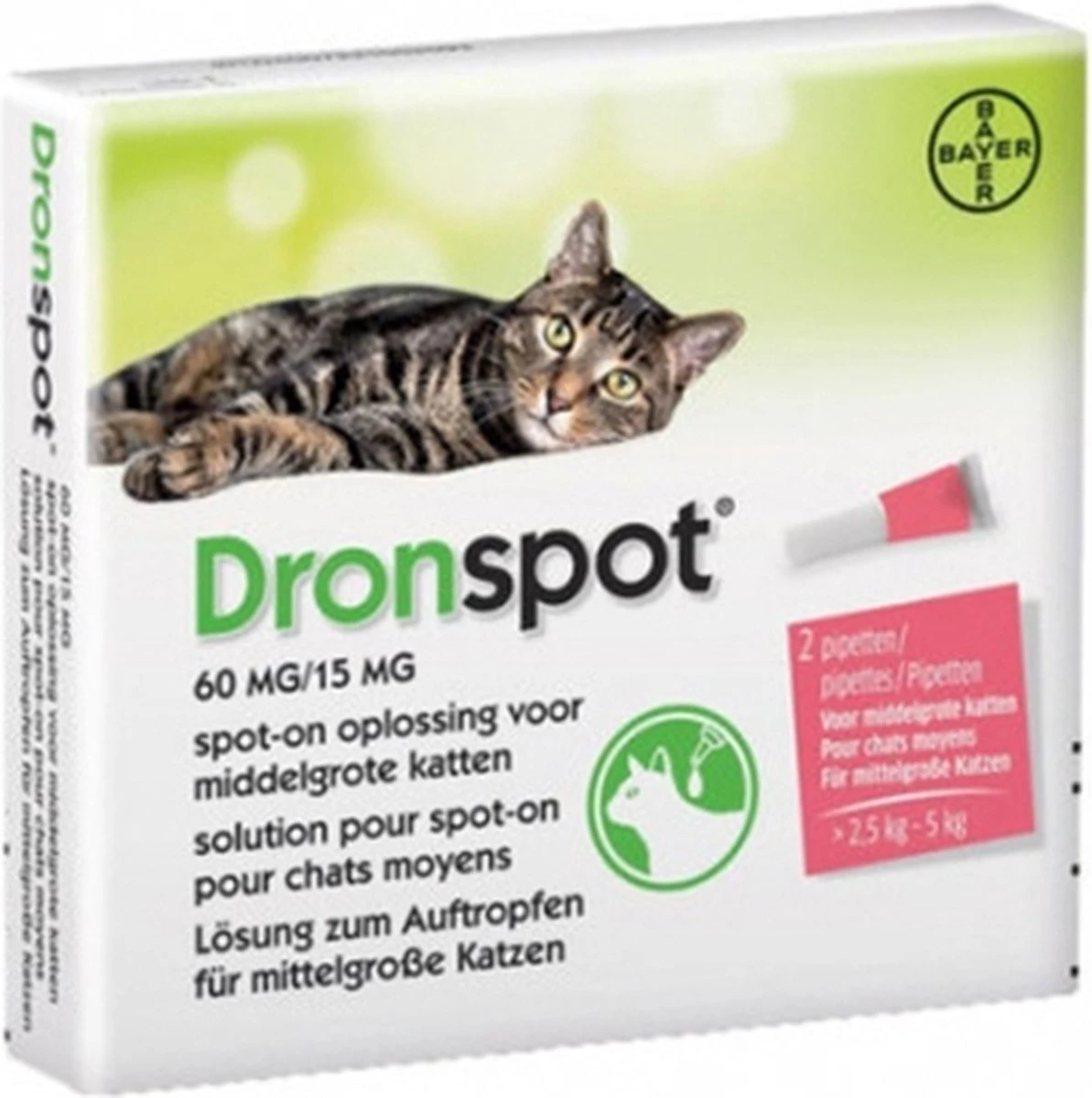 Bayer Dronspot Kat Spot On M 2,5-5 kg 2 PipettenBayer Dronspot Kat Spot On M 2,5-5 kg 2 Pipetten is een ontwormingsmiddel voor katten in pipetvorm, tegen darmwormen als spoelwormen, haakwormen en lintwormen. Het ontwormen van de kat is belangrijk, maar niet altijd even makkelijk. De meeste wormmiddelen zijn uitgevoerd als pil, die niet alle katten even makkelijk accepteren. Een ideaal alternatief is deze Dronspot van Bayer. Dit wormmiddel wordt net zo toegediend als vlooienmiddelen, dus met een vloeistof uit een pipet in de nek. Dit zorgt voor een effectieve bestrijding tegen wormen die veel minder stressvol is voor de kat. Het middel bestrijdt spoelwormen, haakwormen en lintwormen en werkt tegen verschillende stadia van de Toxocara rondworm (L3 en L4 larven). Dronspot is toegestaan vanaf 8 weken én tijdens dracht en lactatie!- Handig ontwormingsmiddel voor de kat, in pipet- Eenvoudig toe te dienen door simpelweg in de nek te druppelen- Werkt tegen spoelwormen, haakwormen, lintwormen en enkele stadia van de Toxocara rondworm- Kan gebruikt worden tijdens dracht en lactatieInhoud: 2 pipettenVoor katten tussen de 2,5 en 5 kg