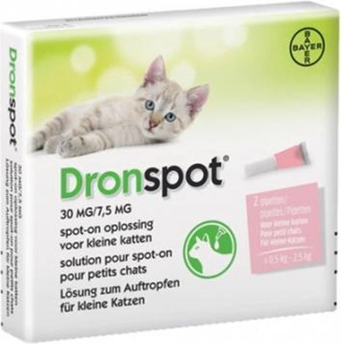 Bayer Dronspot Kat Spot On S 0,5-2,5 kg 2 PipettenBayer Dronspot Kat Spot On S 0,5-2,5 kg 2 Pipetten is een ontwormingsmiddel voor katten in pipetvorm, tegen darmwormen als spoelwormen, haakwormen en lintwormen. Het ontwormen van de kat is belangrijk, maar niet altijd even makkelijk. De meeste wormmiddelen zijn uitgevoerd als pil, die niet alle katten even makkelijk accepteren. Een ideaal alternatief is deze Dronspot van Bayer. Dit wormmiddel wordt net zo toegediend als vlooienmiddelen, dus met een vloeistof uit een pipet in de nek. Dit zorgt voor een effectieve bestrijding tegen wormen die veel minder stressvol is voor de kat. Het middel bestrijdt spoelwormen, haakwormen en lintwormen en werkt tegen verschillende stadia van de Toxocara rondworm (L3 en L4 larven). Dronspot is toegestaan vanaf 8 weken én tijdens dracht en lactatie!- Handig ontwormingsmiddel voor de kat, in pipet- Eenvoudig toe te dienen door simpelweg in de nek te druppelen- Werkt tegen spoelwormen, haakwormen, lintwormen en enkele stadia van de Toxocara rondworm- Kan gebruikt worden tijdens dracht en lactatieInhoud: 2 pipettenVoor katten tussen de 0,5 en 2,5 kg