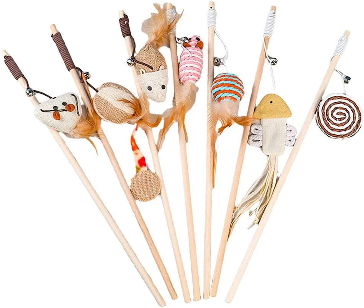 Specificaties. Materiaal: kattenspeelgoed. Elk speelgoed is gemaakt van natuurlijk houten stok, elastische touwen en veren. Het veerspeelgoed is aan een elastiek, dat aan de stang is bevestigd, veilig voor je katten. Lengte staafje: ca. 40 cm, flexibele draadlengte 42 cm