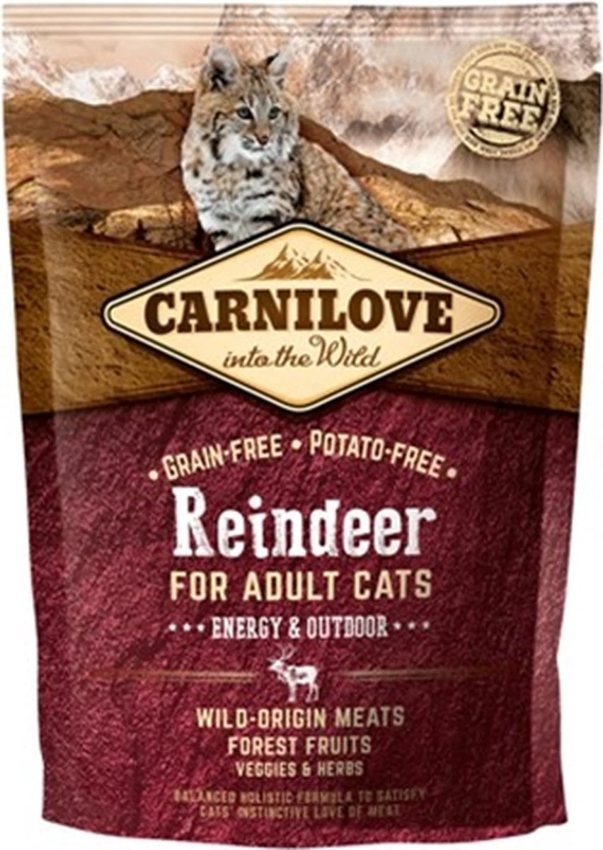 Carnilove Reindeer Energy / Outdoor 400 gr Carnilove Reindeer Energy / Outdoor 400 gr is graanvrij, kwalitatief hoogwaardig kattenvoer voor katten met rendier, speciaal voor volwassen buitenkatten met hoge energiebehoefte. Deze brokken zijn geheel vrij van aardappel en graan, omdat deze ook niet in het natuurlijke dieet van de wilde kat en diens voorouders voorkomt. In plaats daarvan is er gebruik gemaakt van ingrediënten die beter aansluiten bij de voedingsbehoefte van de kat, namelijk een hoog aandeel dierlijke ingrediënten gecombineerd met verse groenten, fruit, kruiden en mineralen. Deze bevatten belangrijke vitaminen en anti-oxidanten, die door de structuur van de gebruikte eiwitten optimaal opgenomen worden door het lichaam. Ook is dit voer verrijkt om bijzonder geschikt te zijn voor volwassen katten met een hogere energiebehoefte. Het voer is nauwkeurig uitgebalanceerd, makkelijker verteerbaar, holistisch en ook gewoon heel erg lekker. – Holistische kattenvoeding voor volwassen buitenkatten – Hoog in vleespercentage – Met groenten, fruit en kruiden die belangrijk anti-oxidanten en vitaminen bevatten – Gemakkelijk verteerbaar en aansluitend bij de natuurlijke voedingsbehoefte van de kat Samenstelling: rendiervleesmeel (28%), wildzwijnvleesmeel (28%), gele erwten (18%), kippenvet (met tocoferolen als conserveringsmiddelen, 13%), kippenlever (4%), tapiocazetmeel (2%), zalmolie (2%), appels (1%), wortels (1%), lijnzaad (1%), kikkererwten (1%), gehydrolyseerde schalen van schaaldieren (een bron van glucosamine, 0,026%), kraakbeenextract (een bron van chondroïtine, 0,016%), biergist (een bron van mannan-oligosachariden, 0,016%), cichoreiwortel (een bron van fructo-oligosachariden, 0,012%), Yucca schidigera (0,01%), algen (0,01%), psyllium (0,01%), tijm (0,01%), rozemarijn (0,01%), oregano (0,01%), veenbessen (0,0008%), bosbessen (0,0008%), frambozen (0,0008%). Analytische bestanddelen: ruw eiwit 41,0%, vetgehalte 19,0%, ruwe celstof 2,5%, ruwe as 5,5%, vochtgehalte 10,0%, calcium 1,1%, fosfor 0,9%, natrium 0,3%, magnesium 0,08%. Nutritionele toevoegingsmiddelen per 1 kg: vitamine A (E672) 23.000 IE, vitamine D3 (E671) 940 IE, vitamine E (3a700) 650 IE, vitamine C (E300) 300 mg, taurine 2400 mg, cholinechloride 2200 mg, L-carnitine 65 mg, niacine 45 mg, biotine 1,8 mg, zink (E6) 150 mg, mangaan (E5) 55 mg, ijzer (E1) 48 mg, koper (E4) 11 mg, jodium (E2) 3,8 mg, selenium (E8) 0,23 mg, DL-methionine (3.1.1.) 14 mg, arginine (3c3.6.1) 12 mg, L-lysine (3.2.3.) 10 mg. Inhoud: 400 gr