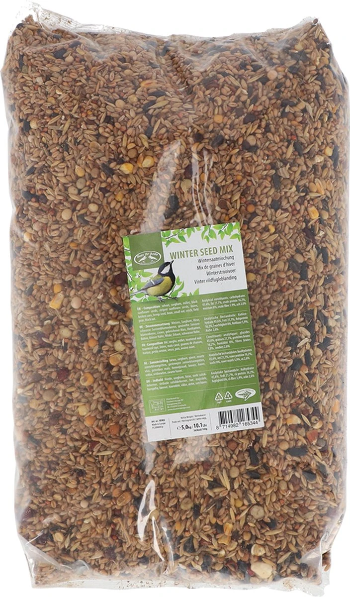Inhoud In de verpakking zit 5 kilogram strooivoer, dat speciaal voor de winter is ontworpen. Het strooivoer is geschikt voor voedertafels, silo’s en kan ook op de grond worden gebruikt. Het vogelvoer bestaat uit tarwe, sorghum, gierst, zwarte zonnebloempitten, gestreepte zonnebloempitten, vlas, gebroken maïs, hennepzaad, bonen, haver, wikke, velderwten en zwarte haver. De zak heeft een afmeting van circa 34 x 26 x 9 centimeter (lxbxh).