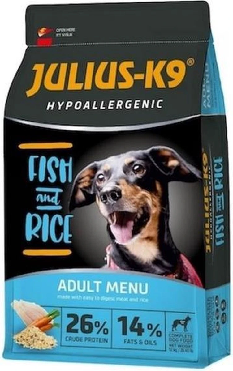 De Julius-K9 Fish & rice is een premium droge voeding voor volwassen honden met een normale activiteit. Zijn hypoallergene verteerbare formule is bijzonder geschikt voor honden met gevoelige maag- en darmen of honden die last hebben van een allergie zoals bijvoorbeeld voor kip.