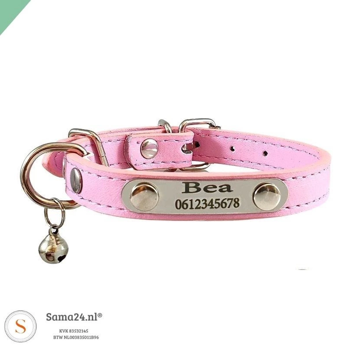 Deze unieke kattenhalsband in de kleur roze, blauw, rood, zwart en bruin voor je hond of kat kan je laten graveren met je naam en telefoonnummer of chipnummer. De kattenhalsband is van het merk Sama24.nl® En komt met een mooie kattenbelletje.