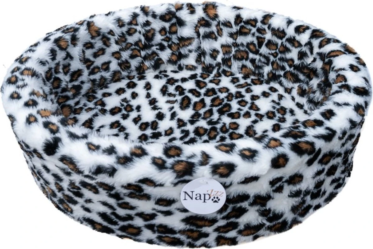 Deze zachte NapZZZ Bontmand Hondenmand/Kattenmand van 66 x 56 x 18 cm in Sneeuw Luipaard Wit is een fijne ligplek voor je kat of hond.