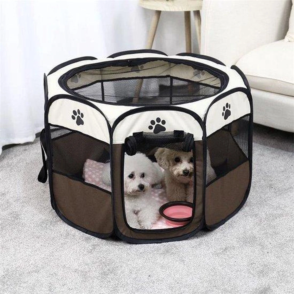Geschikt voor kleine dieren Deze compacte bench is geschikt voor kleinere hondenrassen en andere diertjes. Een grote hond gaat hier niet in passen, want de afmetingen zijn 71x72x45 cm.