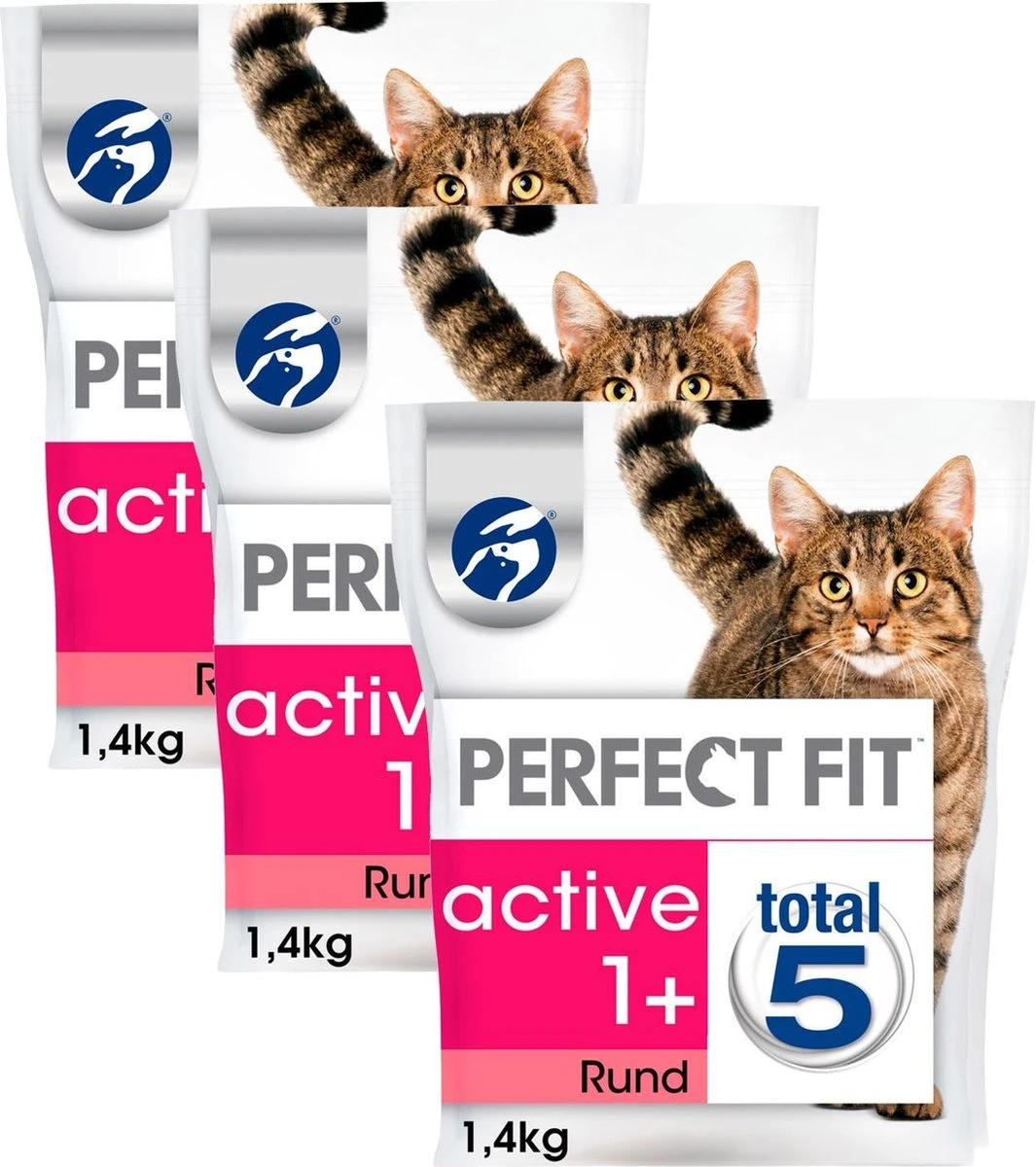 bPerfect Fit Active Rund 1,4 kg/bNaast de unieke PERFECT FIT? Total 5 formule bevat ons Active 1+ product 3 additionele gezondheidsvoordelen die aansluiten op de specifieke behoeften van actieve katten:br /bVitaliteit en beweeglijkheid/b – Volledige en evenwichtige voeding om de vitaliteit van uw kat te ondersteunen, met extra vitaminen B & ijzer voor het behoud van de beweeglijkheid van uw kat.br /bSterk en helder gezichtsvermogen/b – Bevat vitamine A en extra taurine die bijdragen aan een sterk gezichtsvermogen.br /bSterke spieren/b – Het hoge gehalte geselecteerde proteïnen draagt bij aan de ontwikkeling van sterke spieren.br /Zorg dat er altijd vers drinkwater aanwezig is.br /bVoedingsadvies/bGewichtDagelijkse hoeveelheid bij matige activiteitDagelijkse hoeveelheid bij hoge activiteit2 – 3 kg30 – 45 g35 – 50 g3 – 5 kg45 – 70 g50 – 85 g5 – 7 kg70 – 100 g85 – 120 gbr /bSamenstelling:/bgedroogd gevogeltevlees (vet gereduceerd) (o.a. 18% kip), tarwe, dierlijk vet, gehydrolyseerde gevogelte eiwitten, dierlijke eiwitten (gedroogd), maïsmeel, gedroogde granen eiwitten, lever hydrolysaat, verwerkte eiwitten van rund en varken, hele maïs, bietenpulp, natriumchloride, kaliumchloride.br /bToegevoegde stoffen:/bbiotine (0,13 mg/kg), niacine (49.9 mg/kg), vitamine A (16.637 IE/kg), vitamine D3 (945 IE/kg), vitamine E (708 mg/kg), vitamine B1 (13,7 mg/kg), vitamine B2 (6,2 mg/kg), vitamine B5 (12 mg/kg), vitamine B6 (4,1 mg/kg), vitamine B9 (1,8 mg/kg) vitamine C (315 mg/kg), kopersulfaat [pentahydraat] (2,5 mg/kg), Calciumjodaat watervrij (1 mg/kg), zinksulfaat [monohydraat] (306 mg/kg).