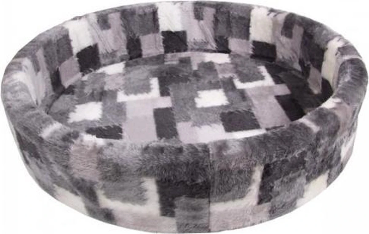 Uitgevoerd in imitatiebont/pluche stof met lapjesdeken/patchwork dessin in diverse grijstinten.