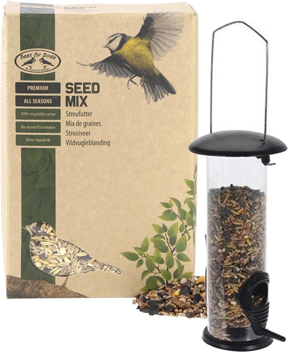 Vogels voederen hangende silo van 23 cm met 2.5 kilo vogelvoer. De silo is gemaakt van kunststof en heeft een tak/boom ophang hengsel. Voor tuinvogels. De voer-mix is geschikt voor alle zangvogels, het hele jaar door.