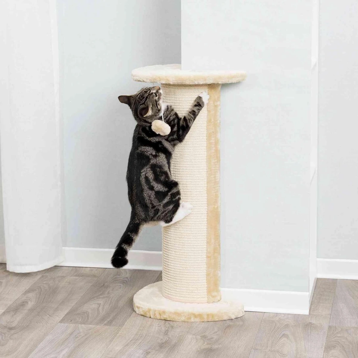 Trixie Krabpaal Lorca Beige 37x27x75 cm• Met pluche bekleding en sisal-krabvlak • Voor op een hoek • Achterkant met pluche bekleed • Met speeltje aan koord