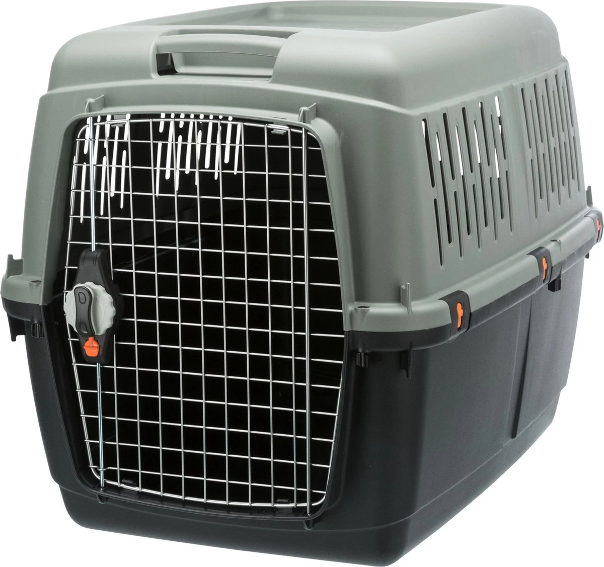 De Trixie Vervoersbox Giona 5 Be Eco Grijs / Antraciet 60 x 81 x 61 kg met IATA-set is een duurzame transportbox voor hond of kat, geschikt voor de meeste vliegreizen. Deze mooie vervoersbox voor hond of kat is superieur op vele vlakken: de Giona-vervoersbox is om te beginnen eco-friendly, daar hij is gemaakt van gerecycled kunststof. Daarnaast wordt deze box geleverd met IATA-set, en wordt hij door bijna alle luchtvaartmaatschappijen geaccepteerd voor vliegreizen (let op: vraag dit altijd na bij jouw luchtvaartmaatschappij!). De kunststof box is voorzien van een metalen deur met vergrendelbare snapsluitingen voor meer veiligheid en heeft tegens een handvat waardoor je de box voort kunt trekken wanneer deze van wielen wordt voorzien. De wielen zijn los verkrijgbaar (Trixie artikel 39899).