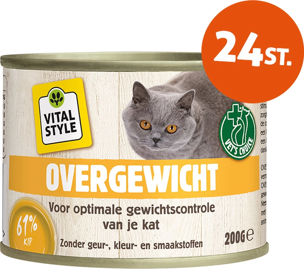 OVERGEWICHT VOLLEDIGE DIEETVOEDING IN BLIK VOOR DE KAT MET EEN MAATJE TEVEEL OVERGEWICHT vleesvoeding van VITALstyle in blik is een volledige dieetvoeding voor de kat met overgewicht. Het bevat maarliefst 57% dierlijke ingrediënten! Het is een uitgebalanceerde mix van topkwaliteit kip, boullion en kruiden, geschikt voor volwassen katten met overgewicht van elk ras. Het is te voeren als complete maaltijd of als aanvulling op de OVERGEWICHT kattenbrokjes.