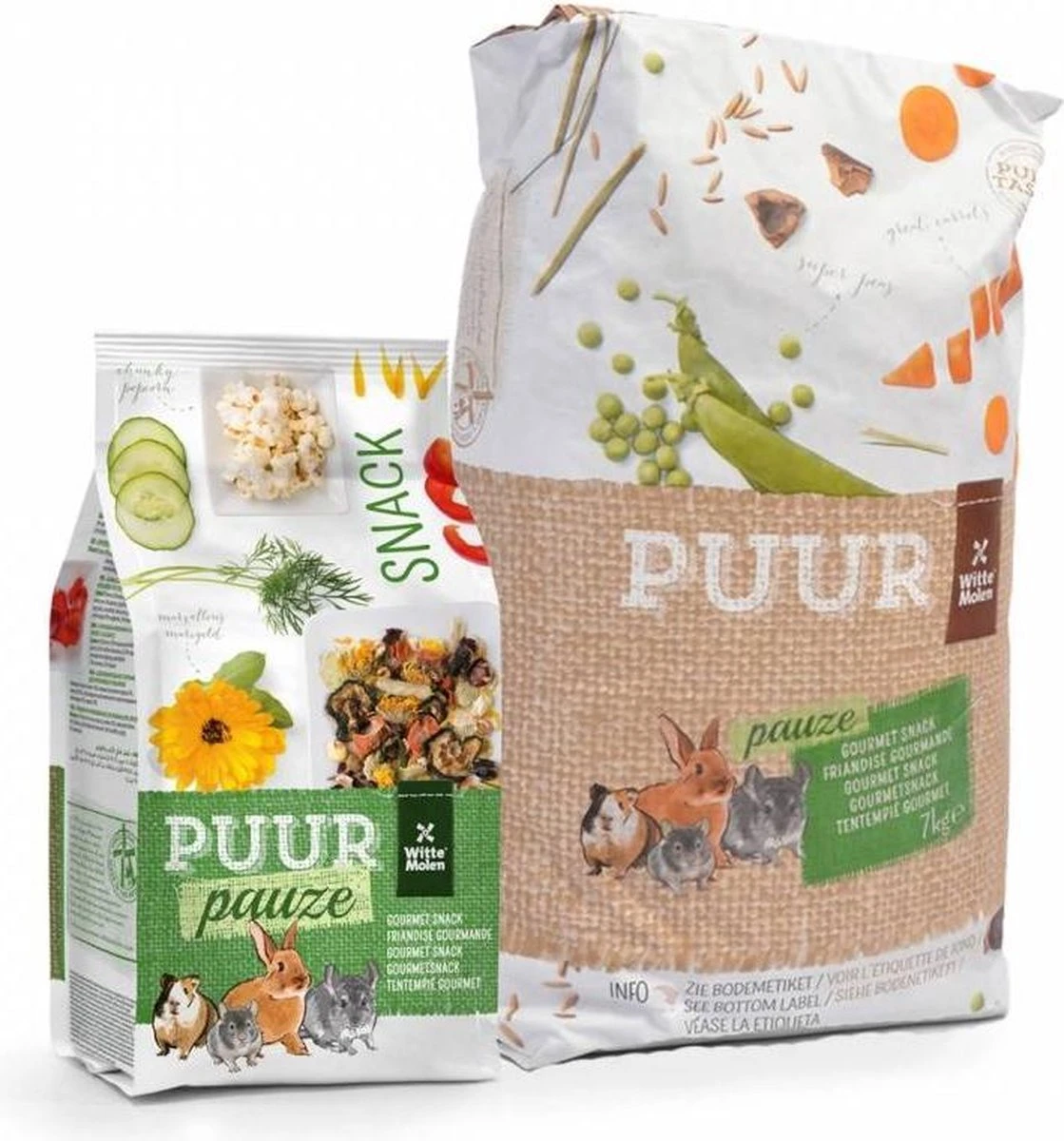 Witte Molen Puur pauze snack muesli is een lekkere verwennerij voor uw knaagdier. Het houdt uw dier bezig en voorkomt daardoor verveling. Bevat onder andere munt, goudsbloem, paprika, komkommer en popcorn. Het kan tot maximum 25% van het dagelijks menu toegepast worden.