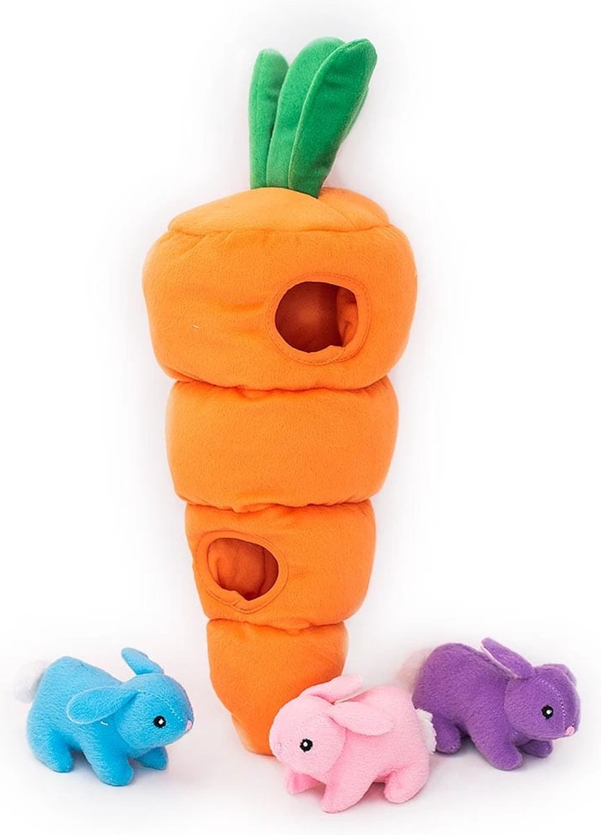 Zippy Burrow Big Carrot Er zitten 3 schattige konijntjes verstop in deze gigantische wortelwoning. Laat uw hond ze er 1 voor 1 opzoeken en uithalen.